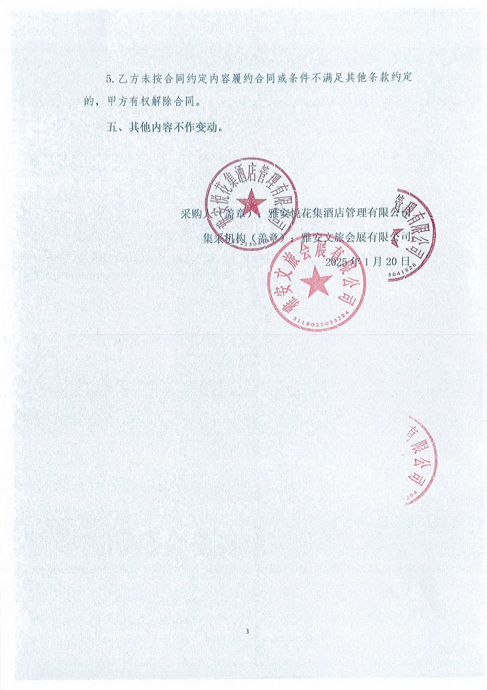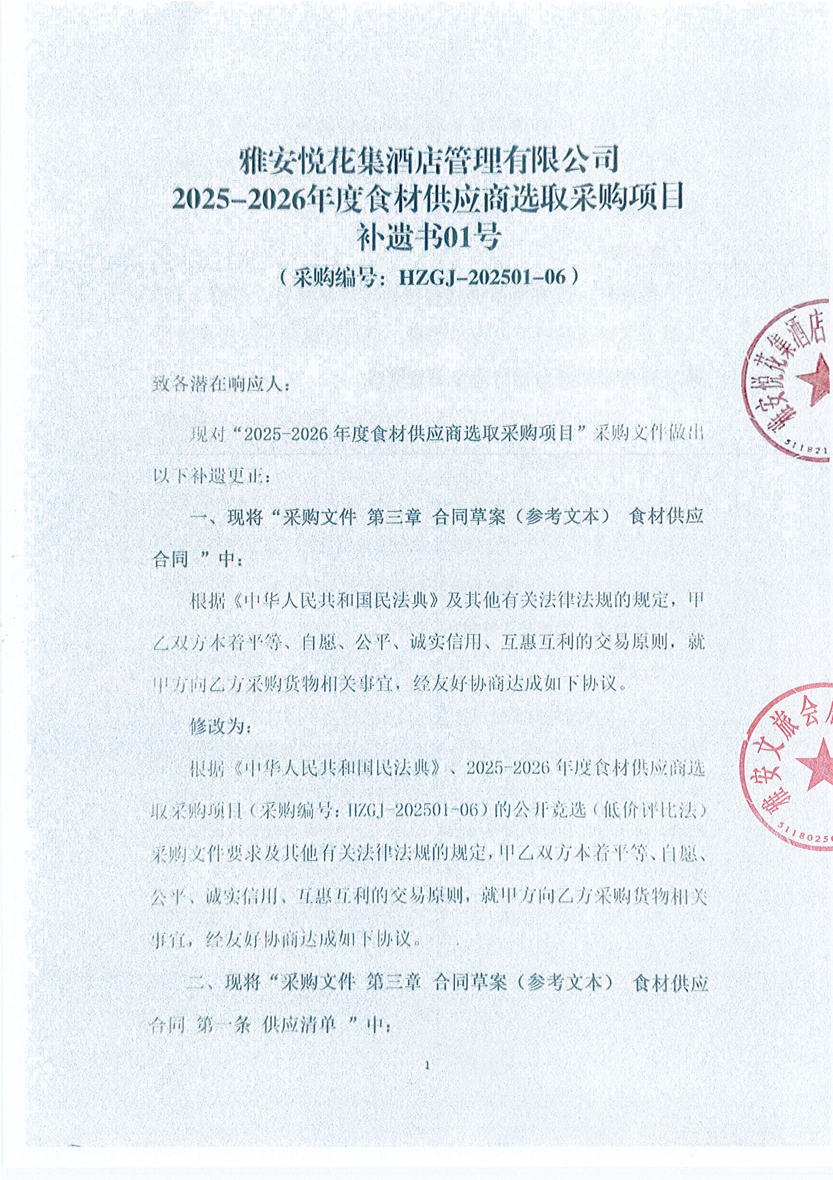 雅安悅花集酒店管理有限公司 2025- 2026年度?材供應(yīng)商選取采購項目 補(bǔ)遺 書01號